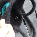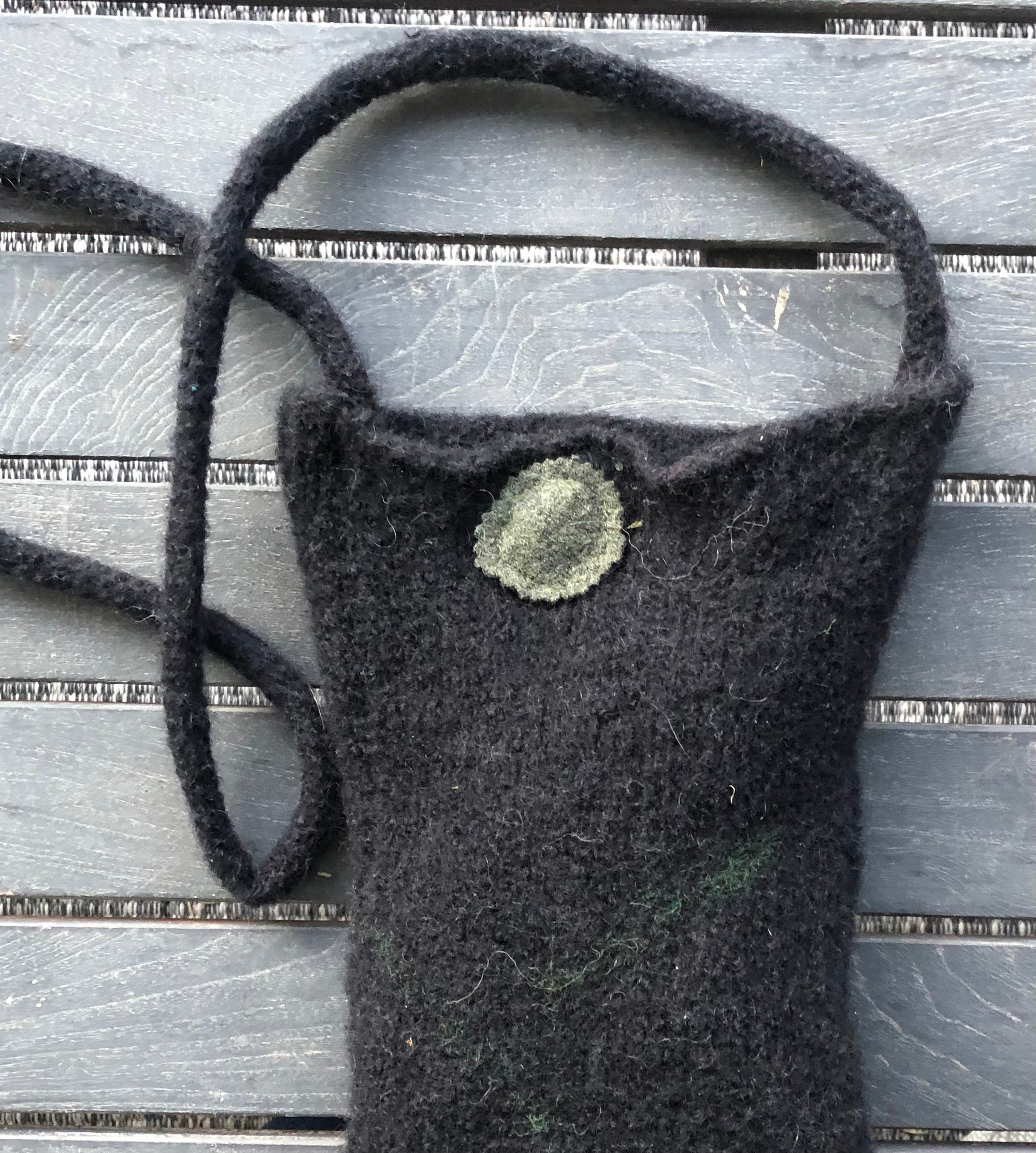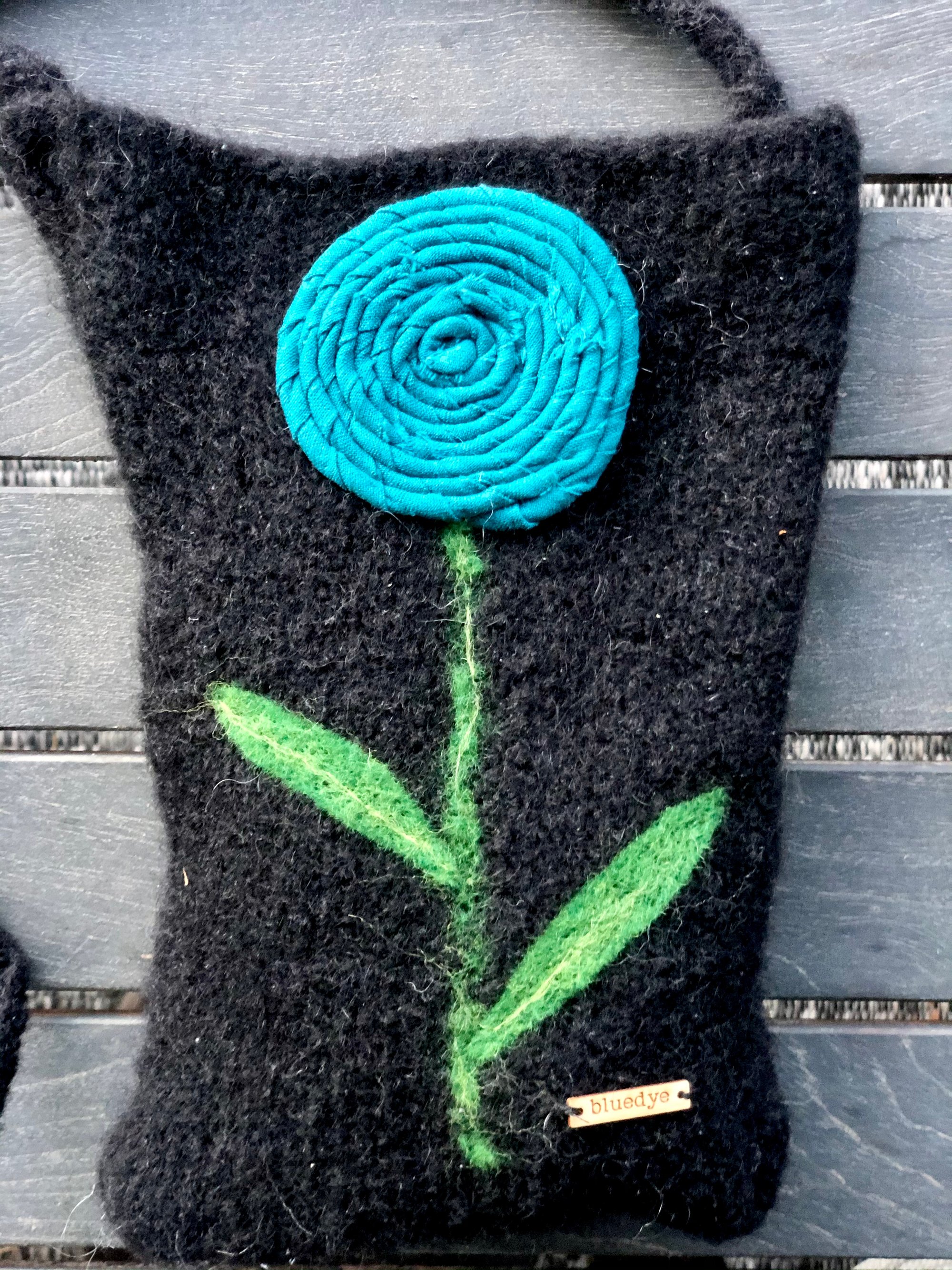 Gorgeous hand knit and felted bag. It’s adorned with a hand rolled turquoise flower and needle felted leaves. Magnetic snap closure. Measures 10.5 x 6.5 strap is 42 inches. Made with love.