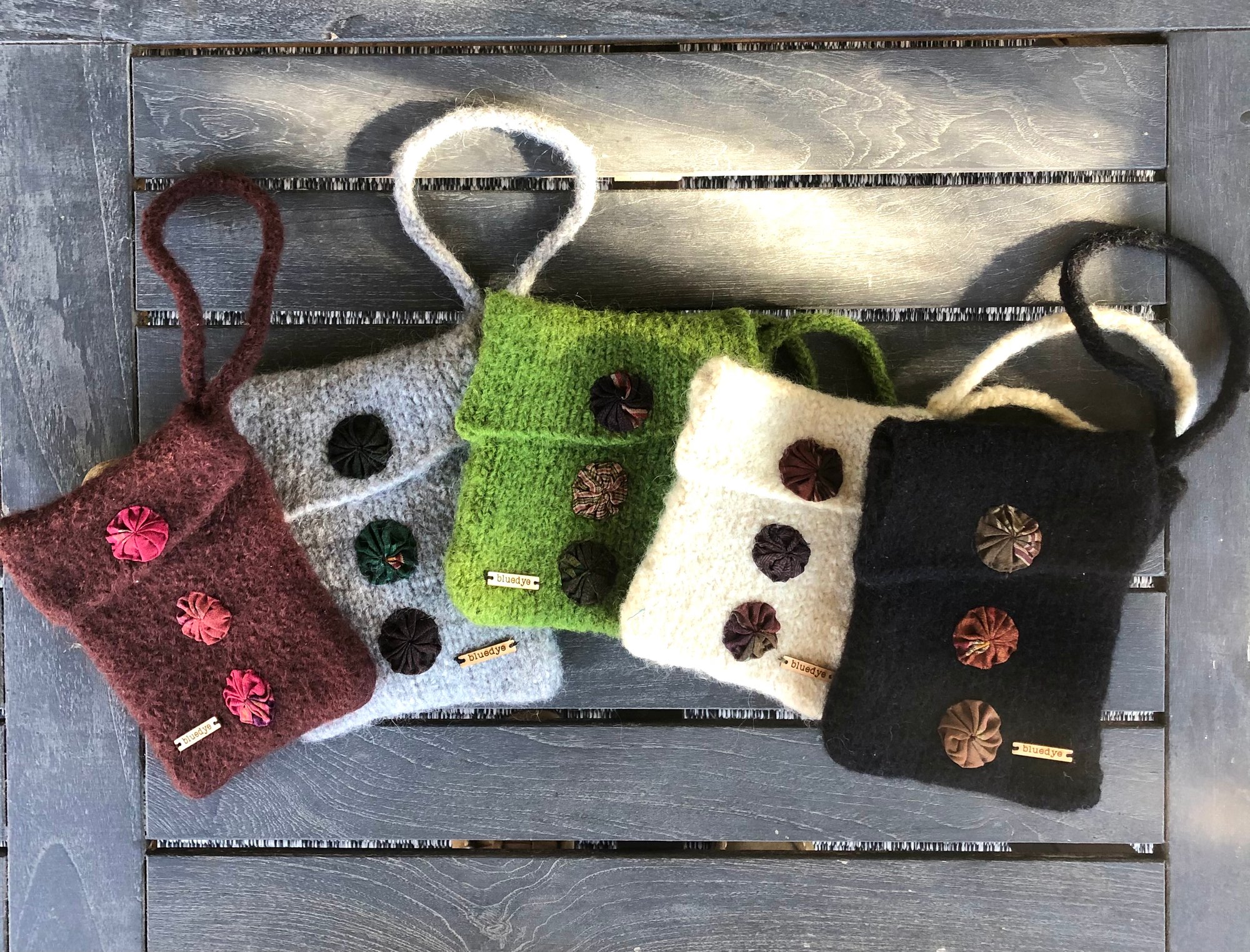 This yummy wristlet is hand knit and felted and embellished with vintage silk yo-yos! Truly special. It’s a perfect size to hold the essentials! Measures 5.25x7