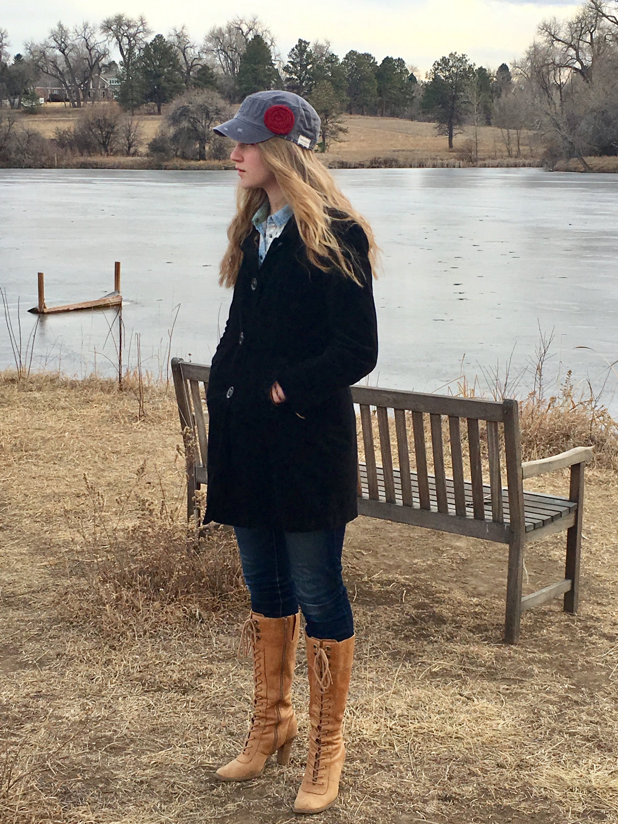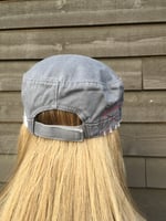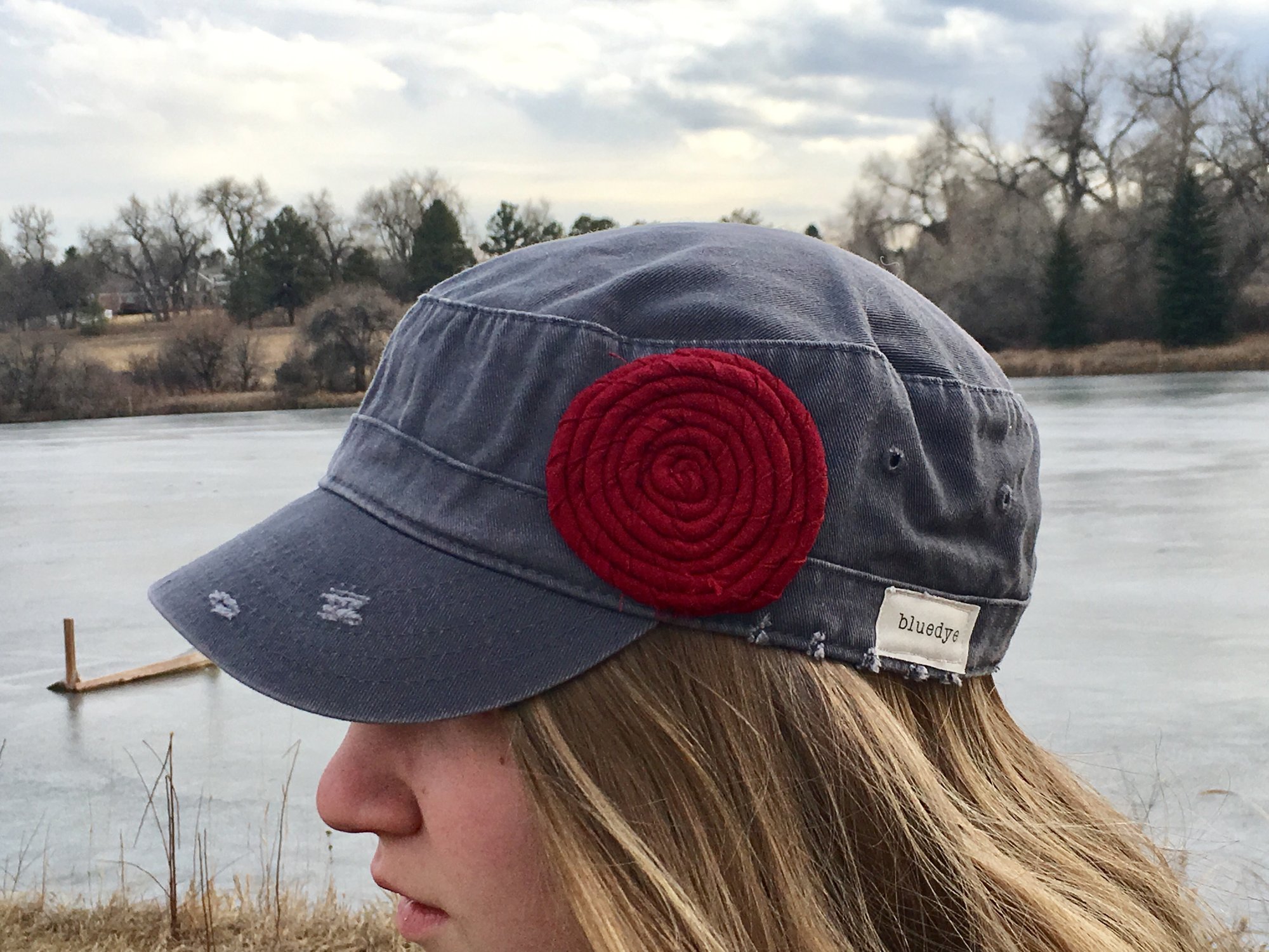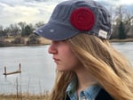 This listing is for a light grey adjustable conductor style hat with a deep red fabric flower. Velcro closure. This is perfect to just throw on and look stylish and put together!
