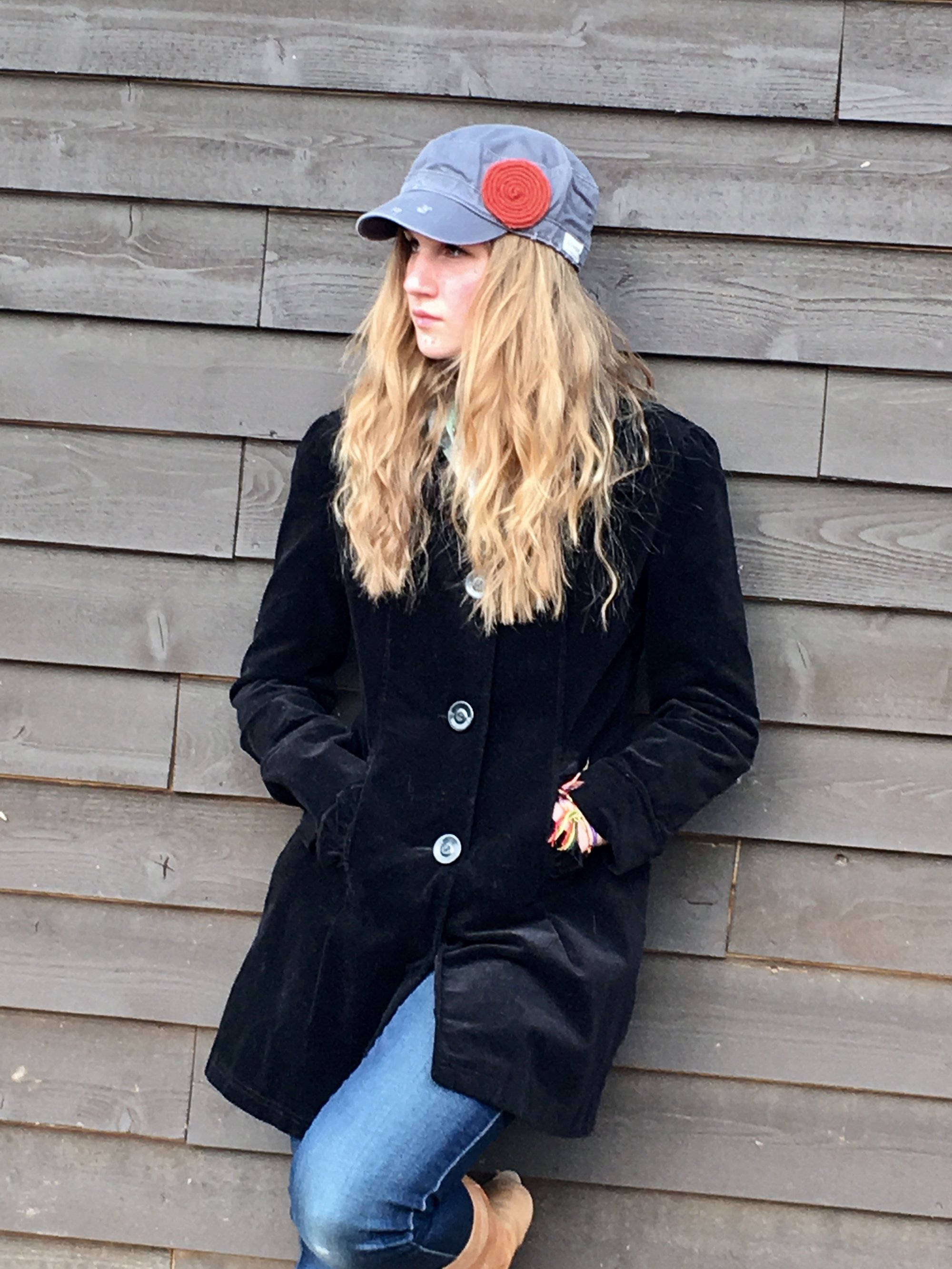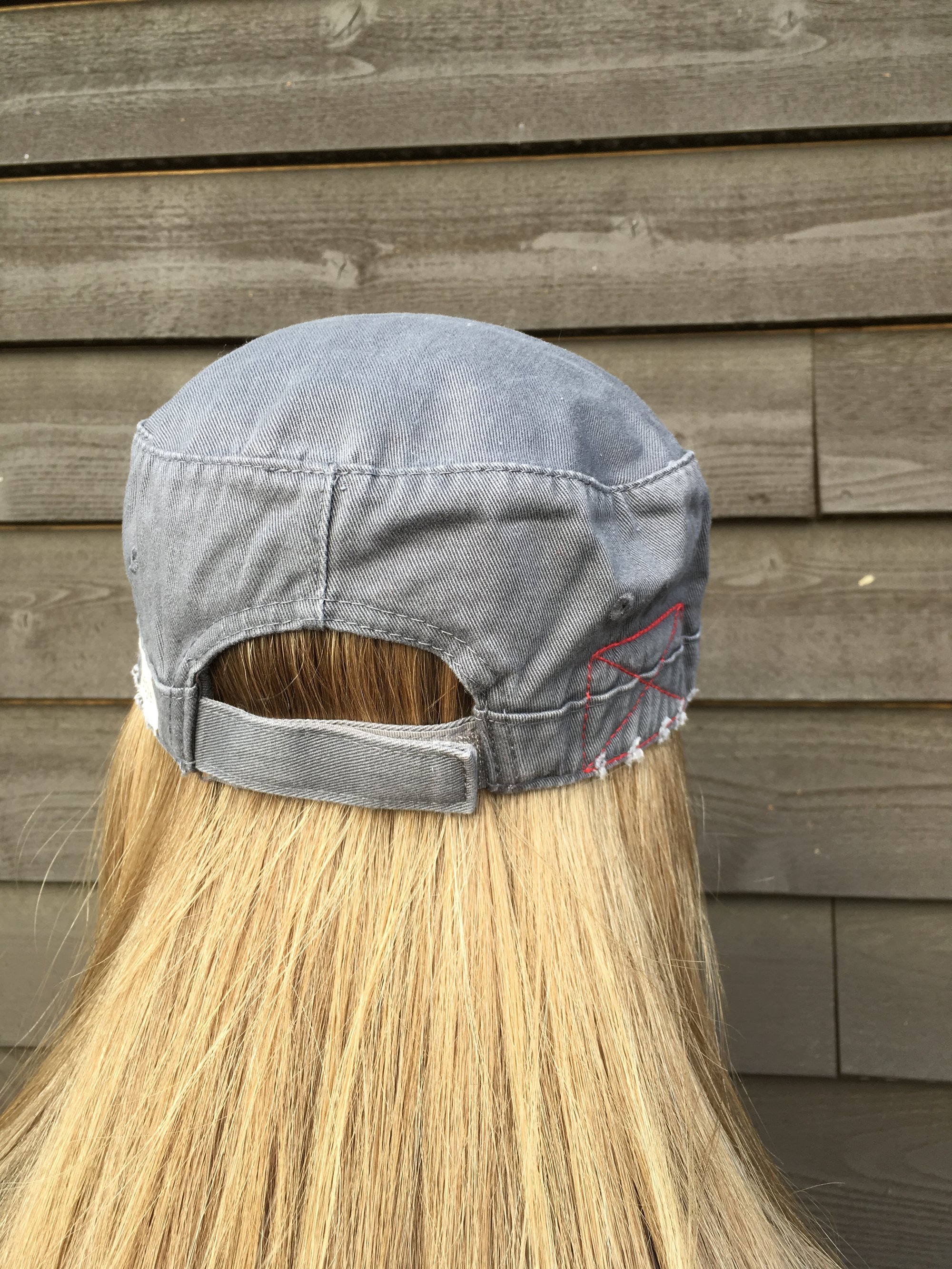 This listing is for one distressed light grey with a rust flower. Adjustable back and Velcro closure. Look casually chic in this hat!