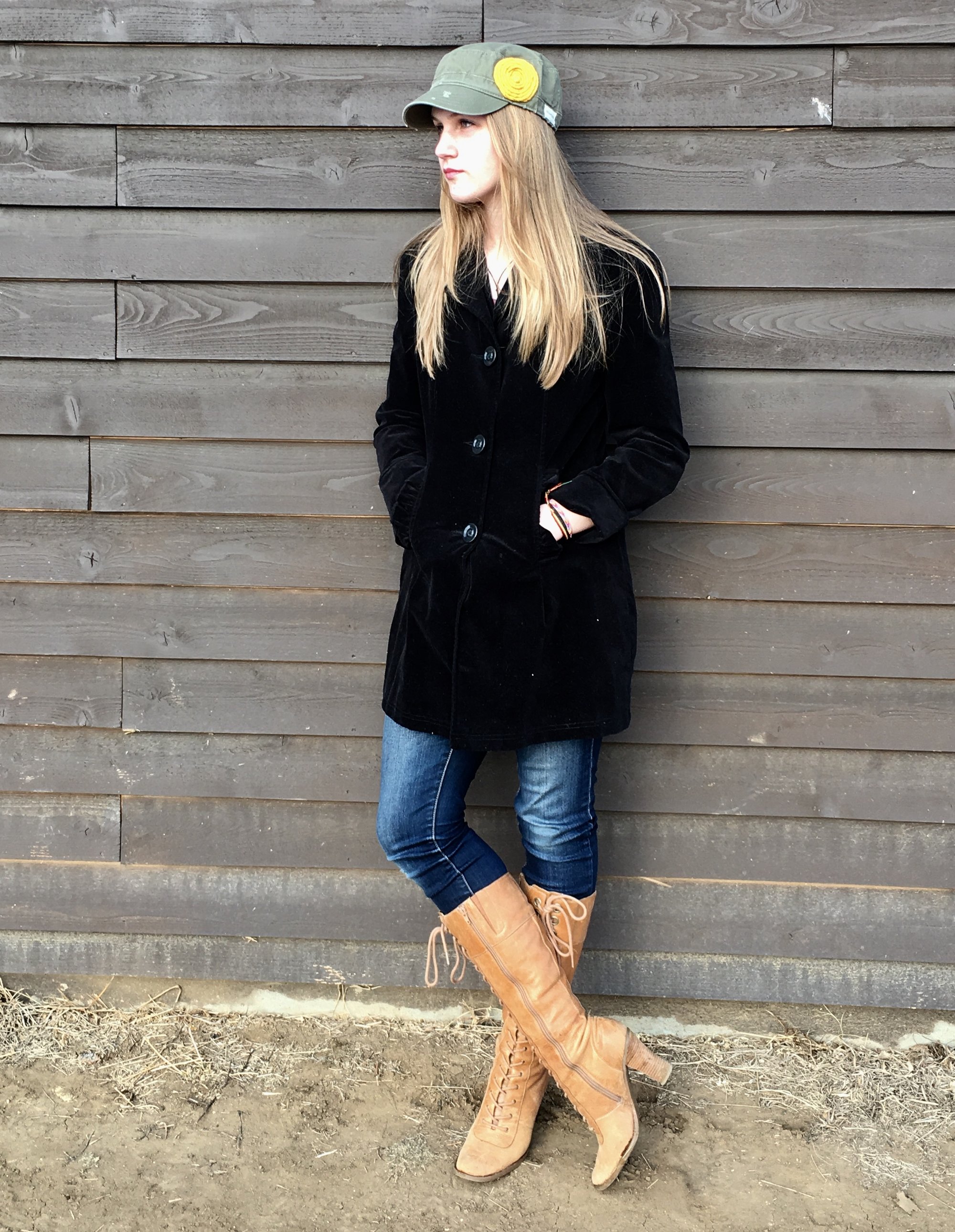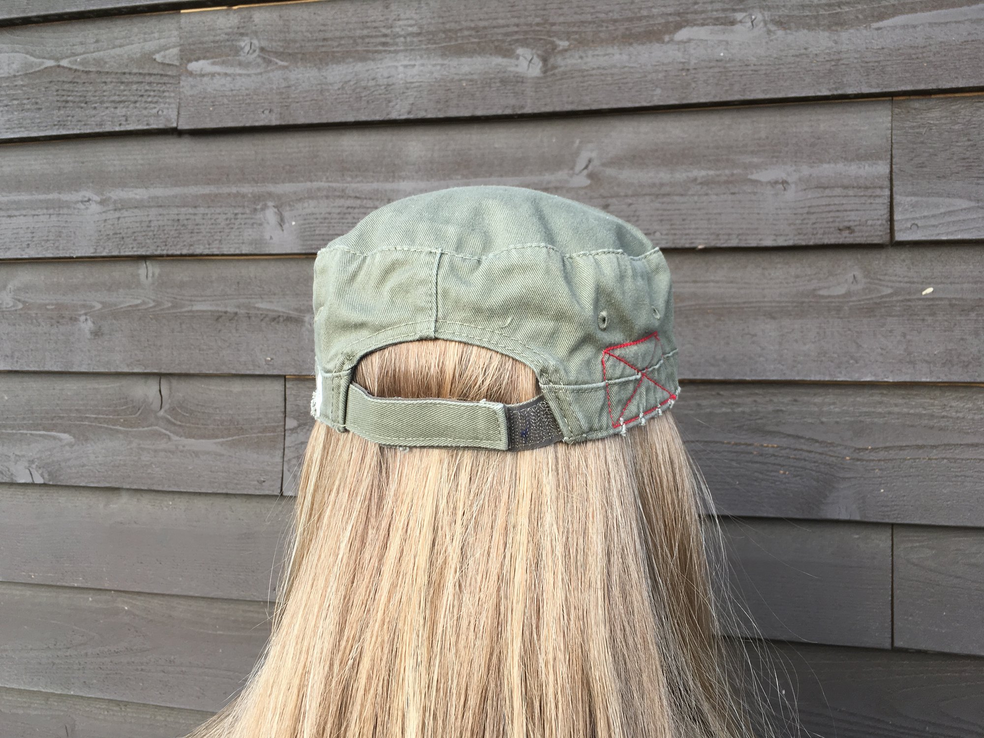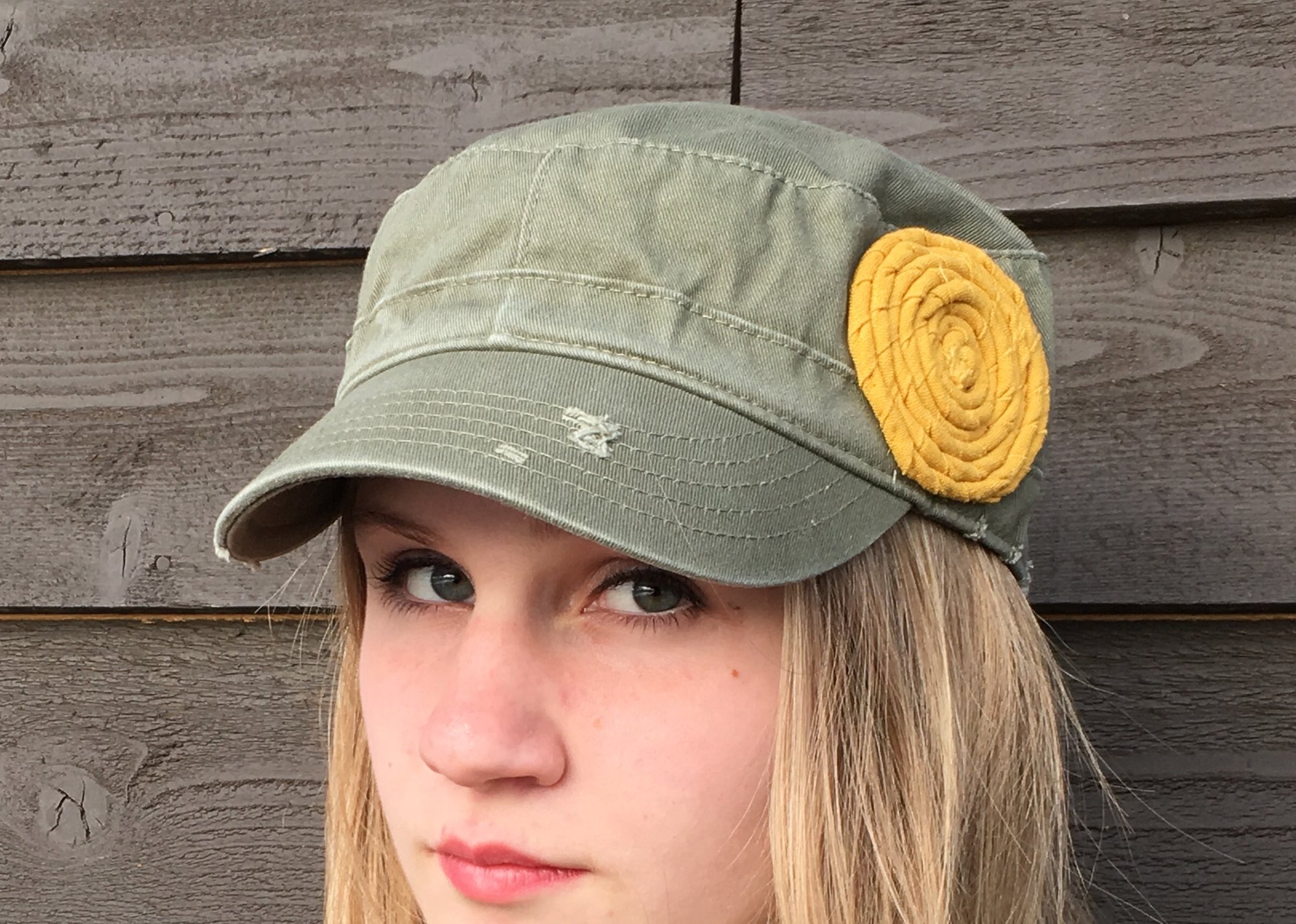 This listing is for a distressed olive hat with a beautiful golden yellow fabric flower. The back is adjustable with Velcro. Toss this on and your good to go!