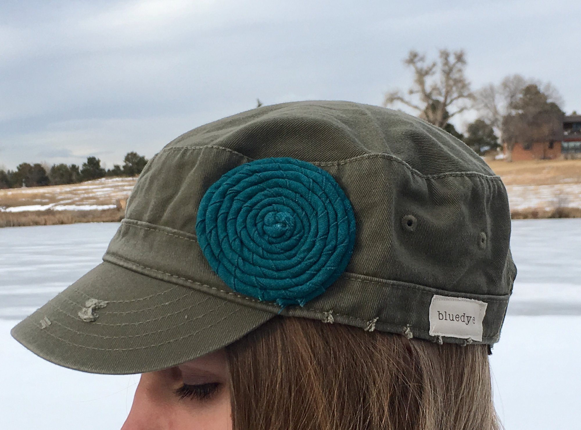 This listing is for one adjustable olive hat adorned with a beautiful turquoise fabric flower. Velcro closure. Toss it on and off you go!