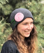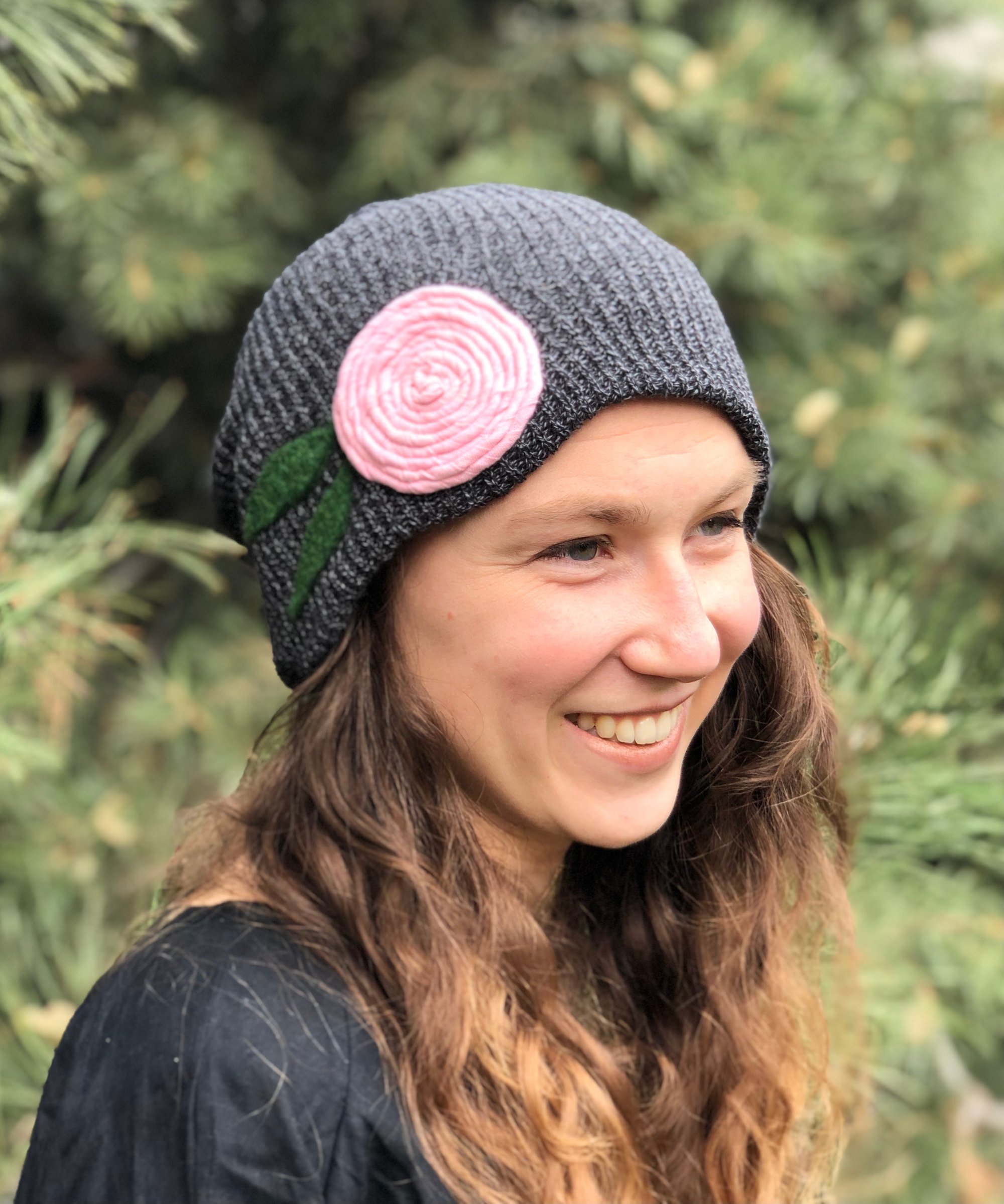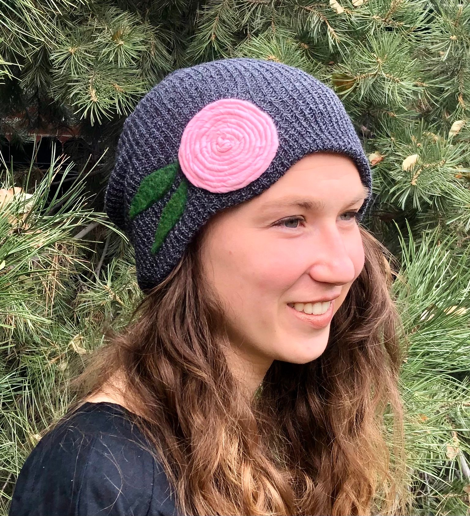 Toss this hat on and elevate your fall and winter fashion game! This super comfy hat is made from acrylic and adorned with a light pink flower and needle felted leaves. Comfy and stylish. It’s a big win!