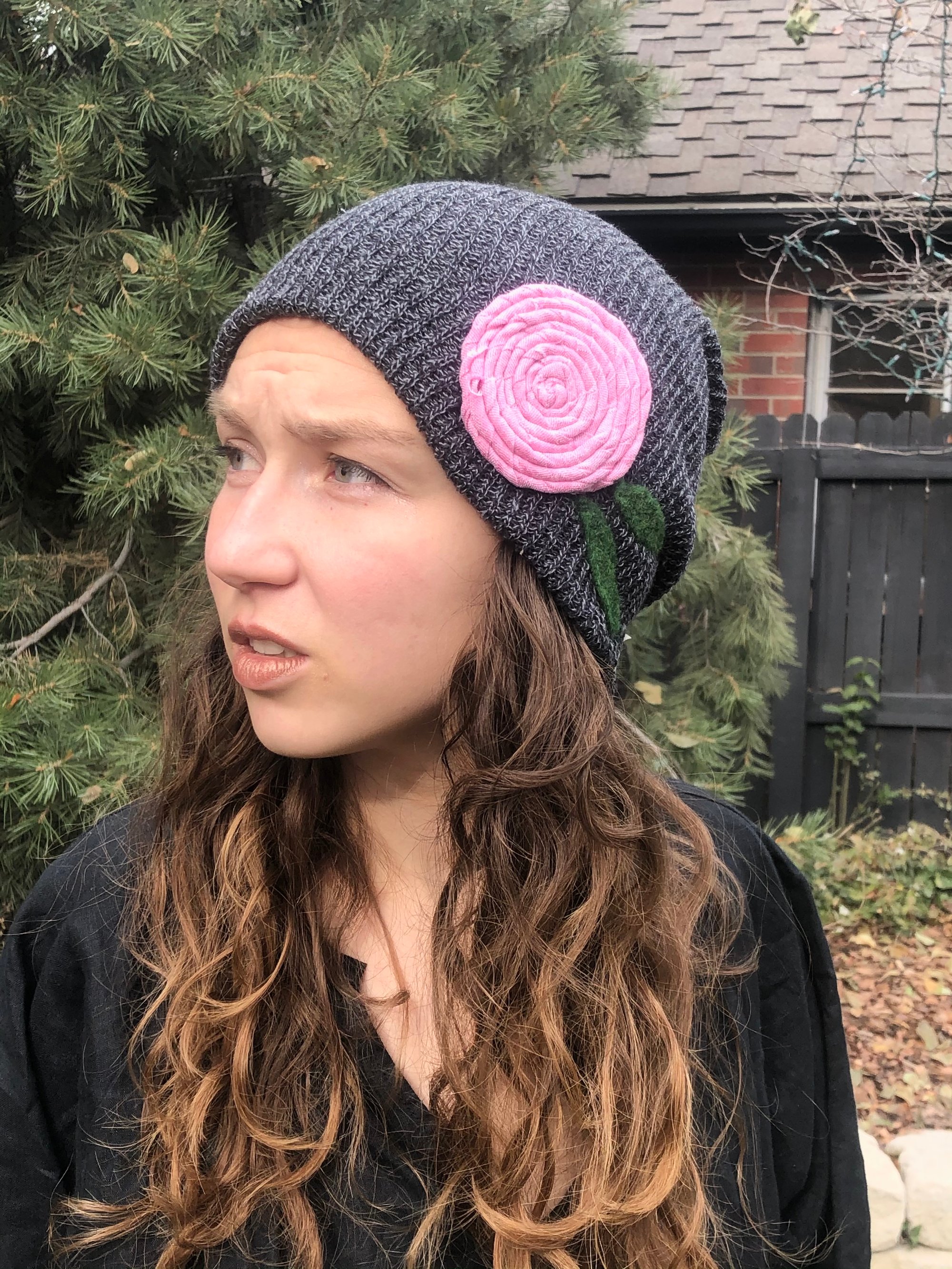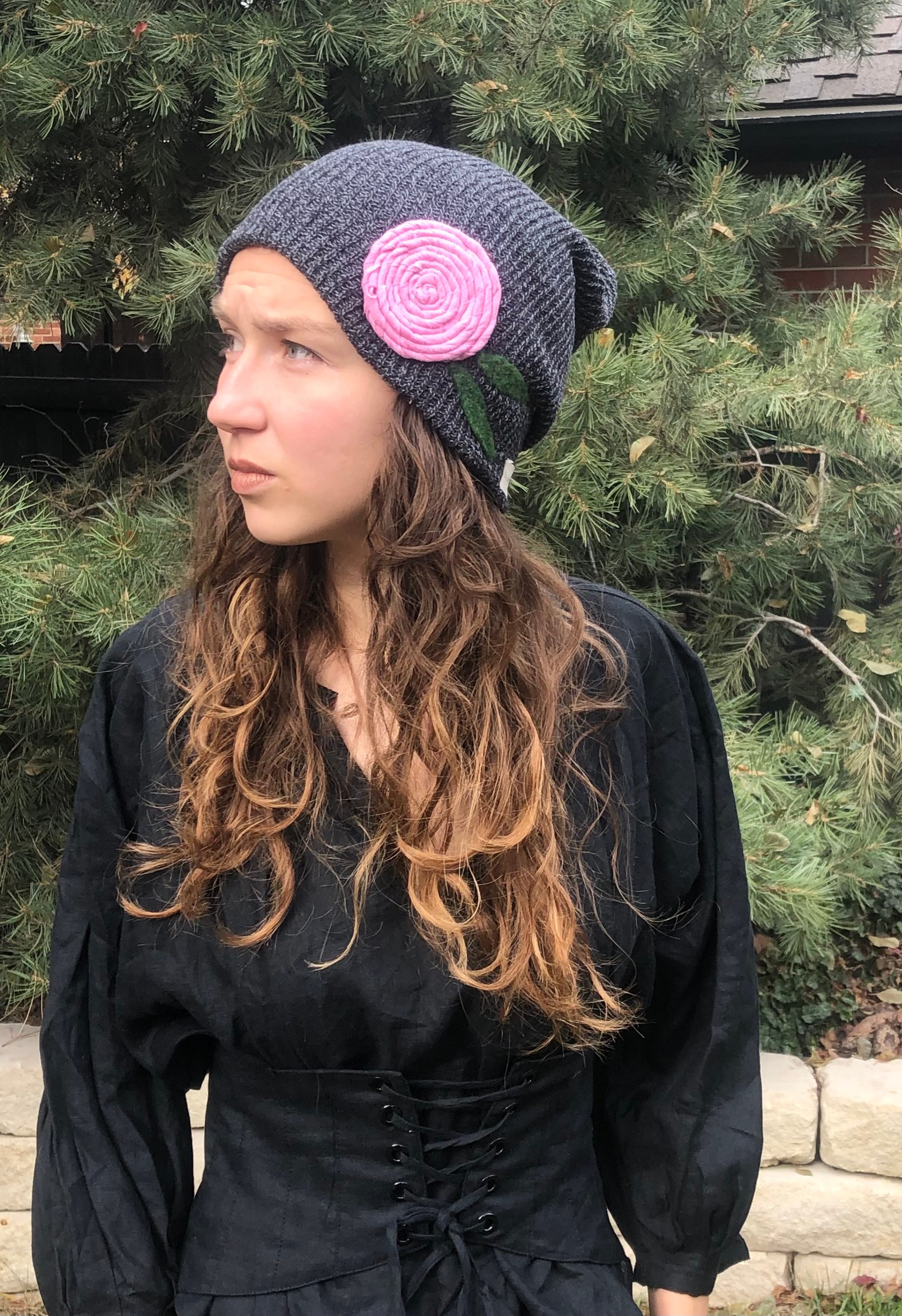 Elevate your fall and winter fashion game with this slouchy hat! Super soft acrylic hat with medium pink flower and needle felted leaves.