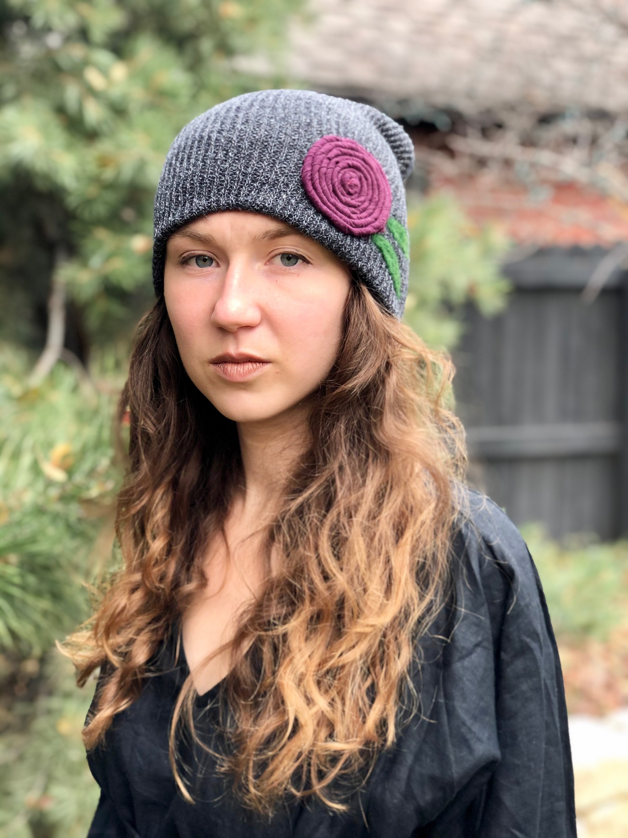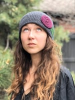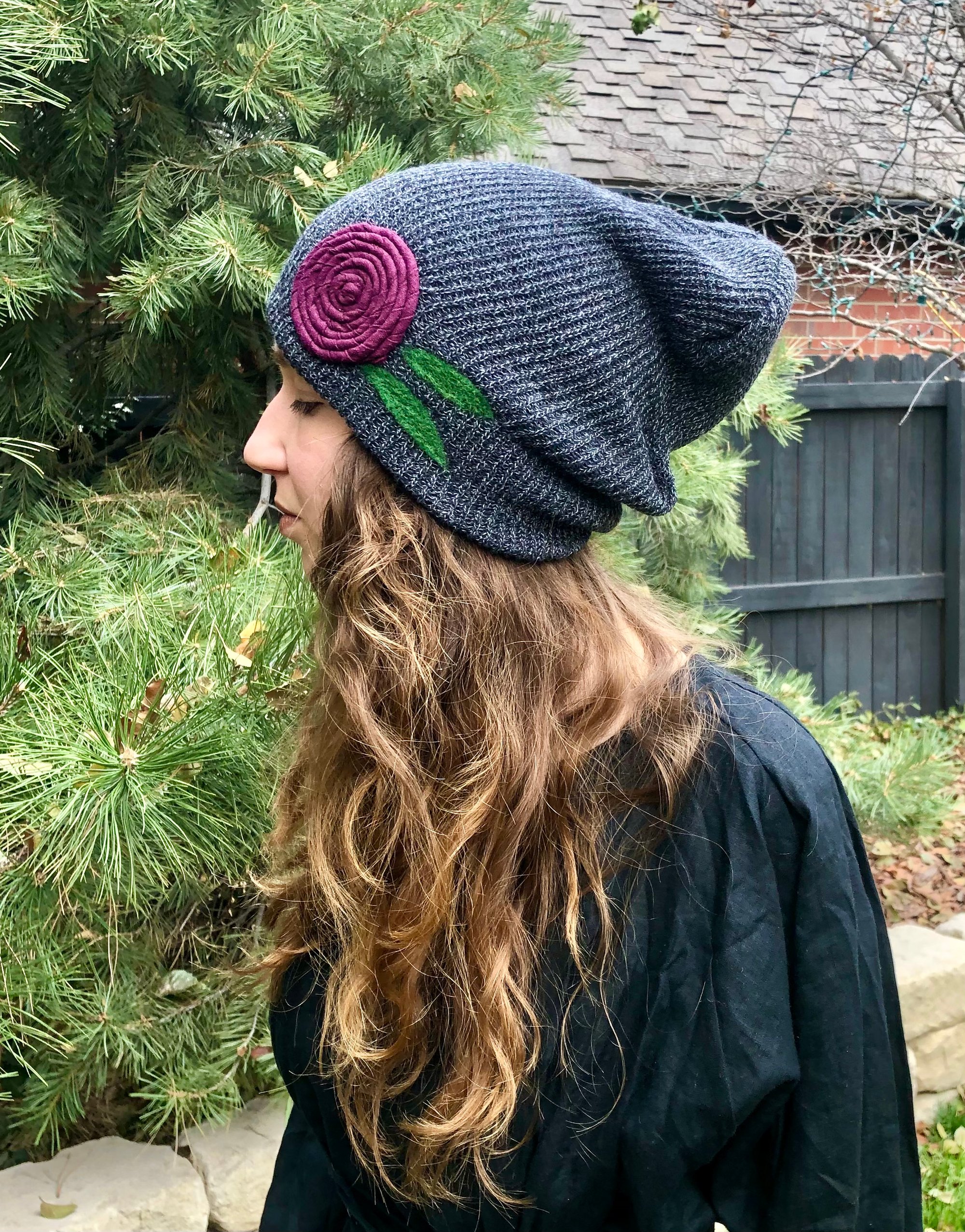 Get your cozy on with this stylish hat! Pop it on when your chilly. Made of super soft acrylic and adorned with a purple flower and needle felted leaves.
