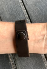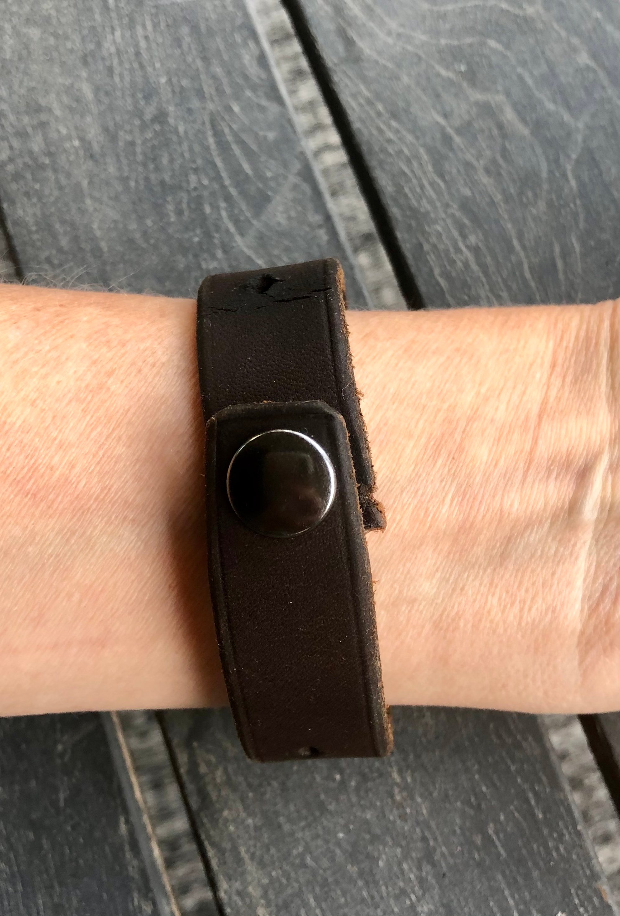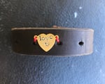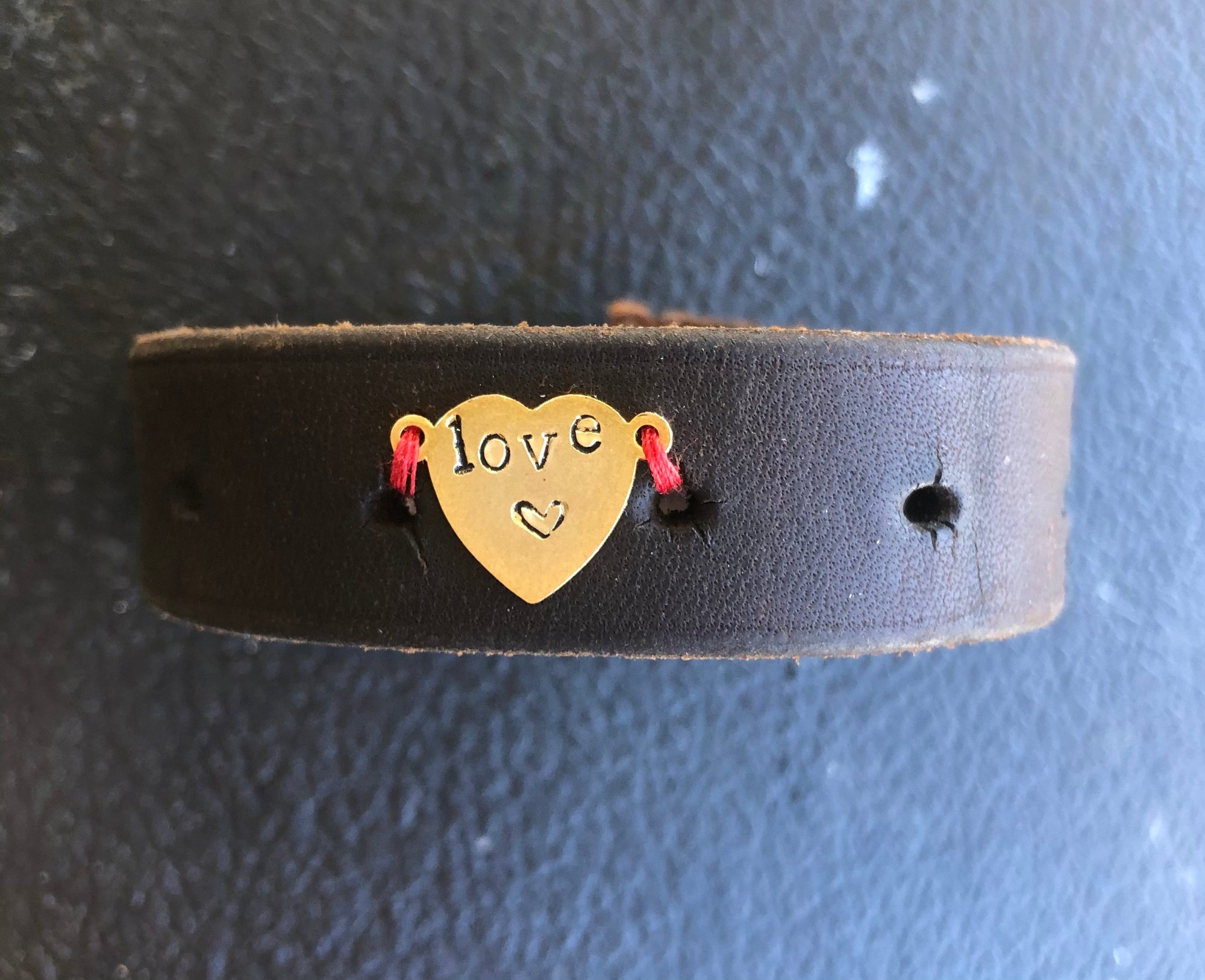 This dark brown leather cuff is made from old horse tack. It’s adorned with a brass heart and hand stamped with “love”